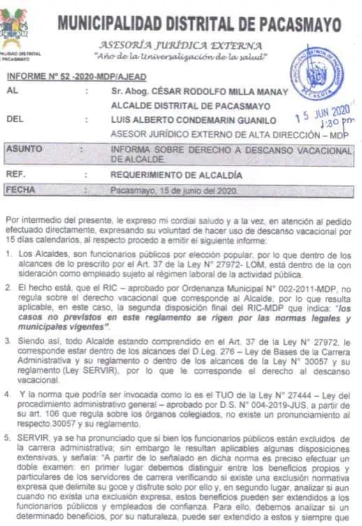 Alcalde distrital de Pacasmayo pide 15 días de vacaciones para cuidar su salud